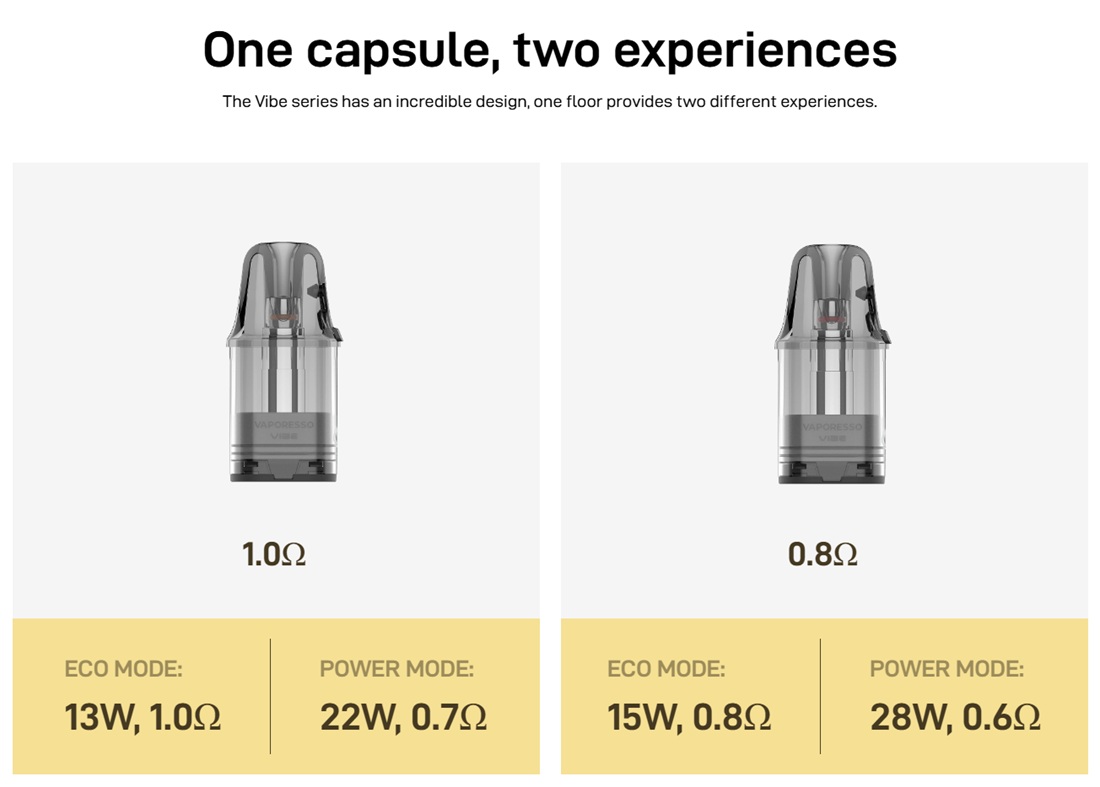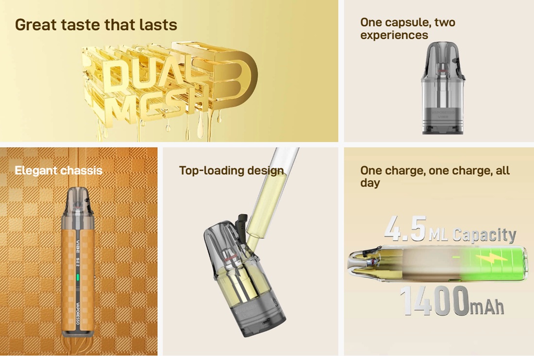 Nova kolekcija POD uređaja kompanije Vaporesso sa oznakom Vibe donosi maksimalno jednostavne uređaje sa impozantnim performansama. U Vibe kertridže je implementirana nova Dual Mesh tehnologija koja menja otpor grejača u zavisnosti od režima rada koji je korisnik aktivirao. Na taj način korisnik osetno menja kako ukus i intezitet, tako i trajanje samih kertridža.