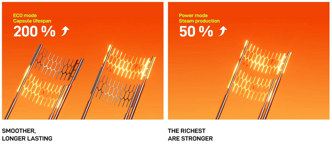 U ECO režimu se naizmenično aktivira po jedna mrežica, u POWER režimu su aktivne obe. Na taj način korisnik može da bira da li želi manje intezivan, gladak ukus ili intezivniji ukus uz proizvodnju veće količine pare.